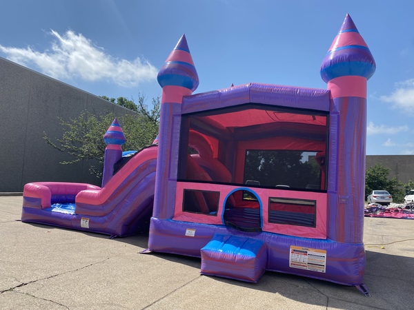 THIS AMAZING UNIT CAN BE USED DRY OR WET ((((NO POOL))) The Purplish Dual Lane Combo is a pretty and posh playhouse! With a dual lane slide, bounce house, climb wall, and basketball hoop, it has no shortage of ways to keep kids entertained! This combo is an all-season unit that guarantees you a great return on investment.