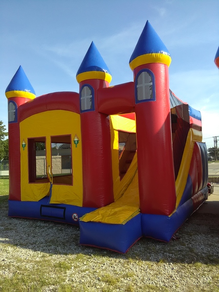 This is a jumping castle with a big slide. With the four spires on the pillars, the bouncer looks like a large and old castle from a distance. Imagine you as a king holding a grand party with your queen and your princesses or princes at your palace.The windows of mesh design make it breathable and easy to observ PRICING OPTION